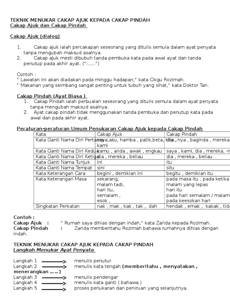 22102020 Semasa menukar cakap ajuk kepada cakap pindah kata ganti nama diri kata ganti nama tempat kata ganti nama tunjuk kata keterangan masa dan kata keterangan cara akan berubah seperti di bawah. Would appreciate it a lot. Tulis semula perbualan di bawah ke dalam bentuk karangan biasa dengan menggunakan cakap pindah.